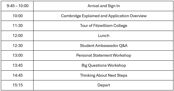 Our year 12 Visit Days are a chance for prospective students to visit Fitzwilliam College, meet some current students, and take part in workshops delivered by Fitzwilliam staff. These workshops will provide information about Cambridge and the application process, as well as offer the opportunity to develop key skills needed for a good application.