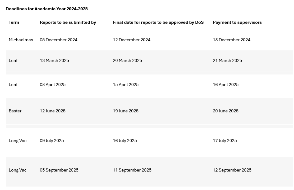 New supervisors do not need to apply for this payment: eligible supervisors are identified by the date they were given access to CamCORS and must submit at least one approved supervision report to qualify for the payment. Eligibility will be checked, and payments made, towards the end of January, April, July, and October each year. Payments will be sent either directly to a new supervisor or via their College, according to their preferred payment method on CamCORS.